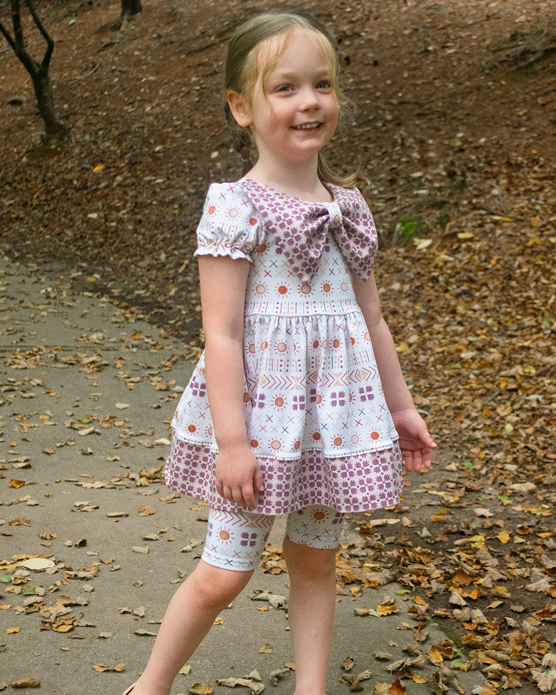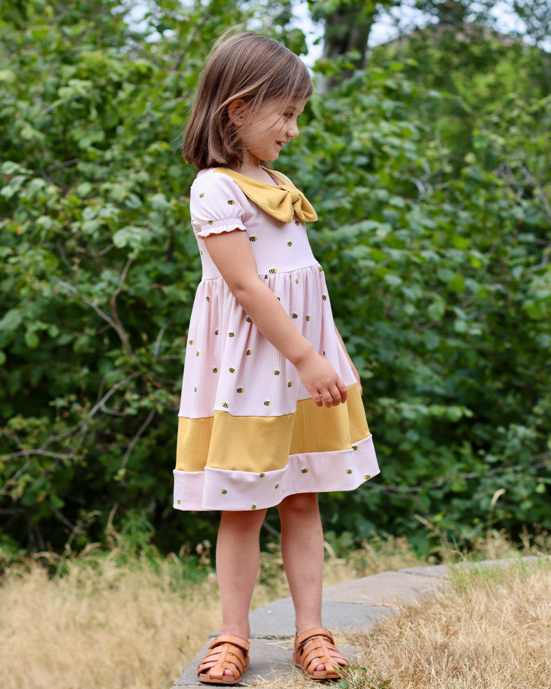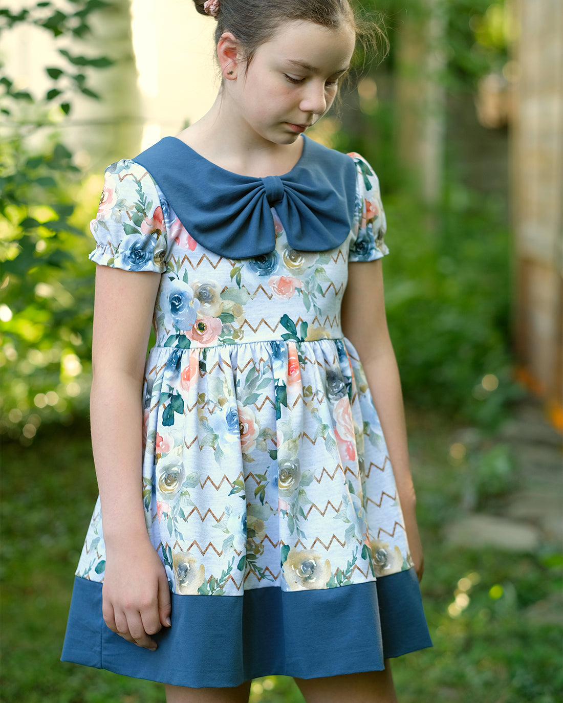 Bellamy is a charming knit dress and top pattern designed with timeless style in mind. It features a show-stopping oversized collar, with a vintage flair and can be sewn in either a soft round or crisp square shape. The sleeves add to the sweetness with dainty puff styling, available in both long and short options. It comes in three length options, top, vintage, and knee. The dress view includes two playful hem finishes: a classic wide hem band or a split hem band for a stylish accent.