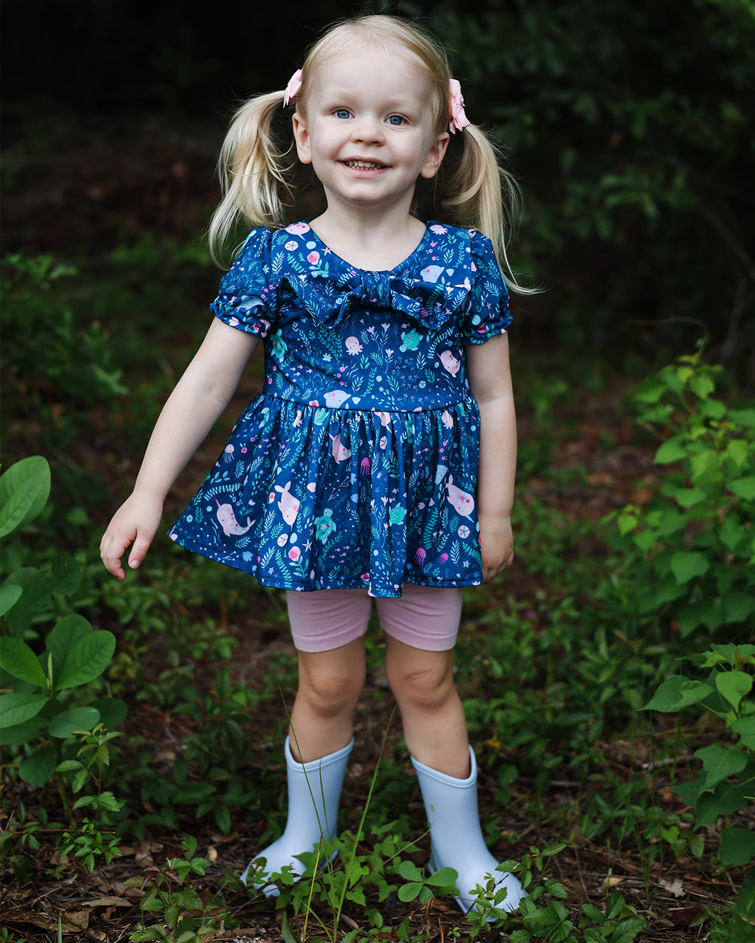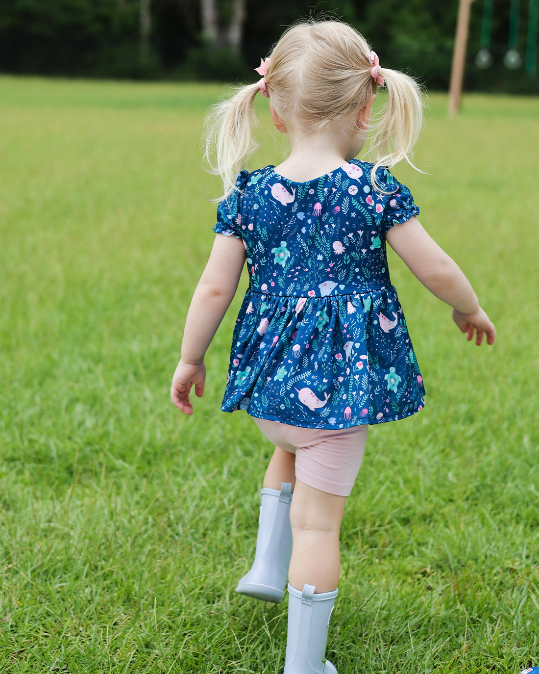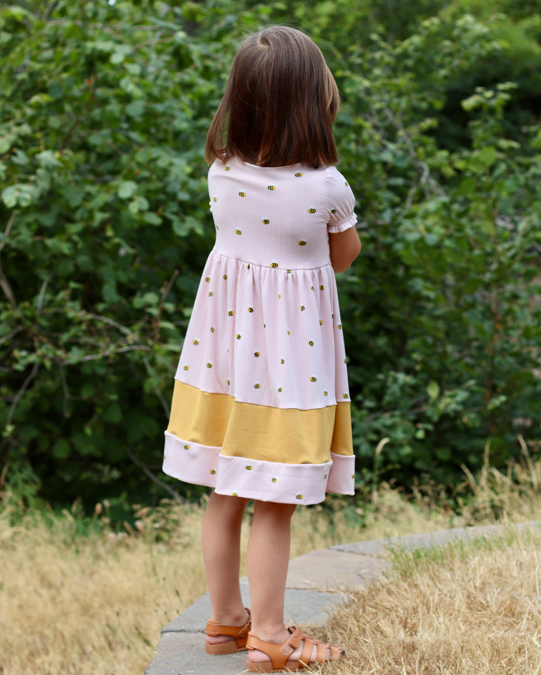 Bellamy is a charming knit dress and top pattern designed with timeless style in mind. It features a show-stopping oversized collar, with a vintage flair and can be sewn in either a soft round or crisp square shape. The sleeves add to the sweetness with dainty puff styling, available in both long and short options. It comes in three length options, top, vintage, and knee. The dress view includes two playful hem finishes: a classic wide hem band or a split hem band for a stylish accent.