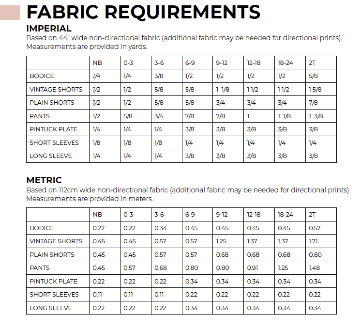 - Pattern pieces for Newborn to 2 years