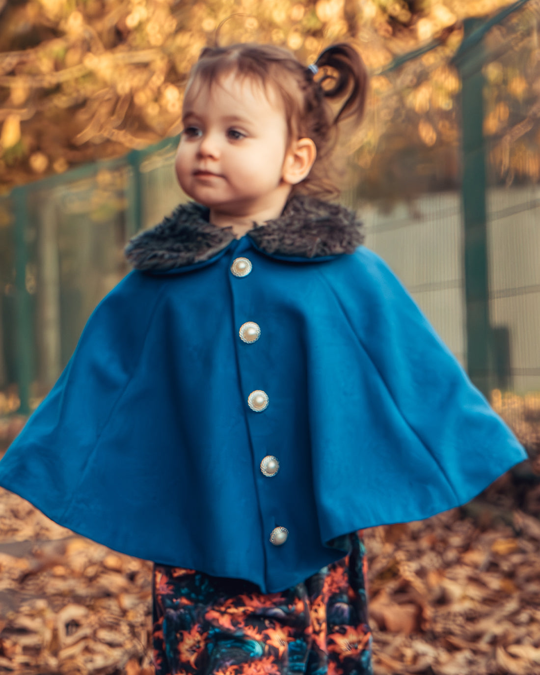 The Mahonia cape-style coat is a timeless piece that combines elegance with a touch of whimsy, thanks to its oversized Peter Pan collar. This distinctive collar adds a playful yet sophisticated flair, making it perfect for both casual and formal occasions. There are options to include neck ties or faux welted pocket slits for a functional and classic look!