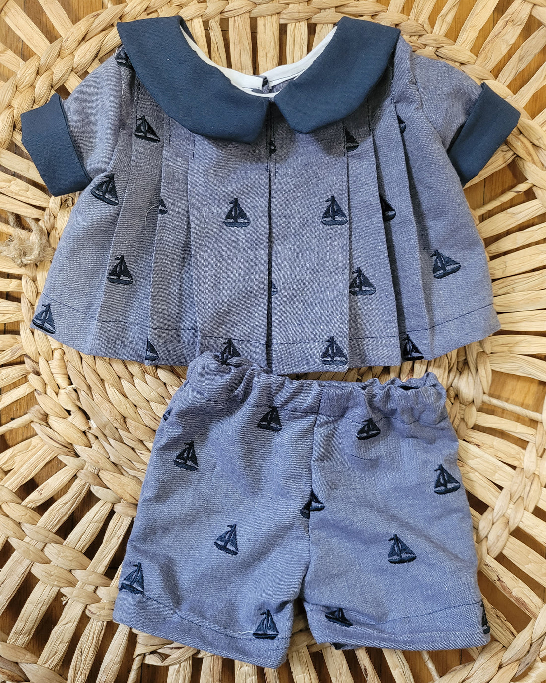 Pepper is a sweet vintage-inspired pleated play shirt and dress with a royal flair! The shirt option has cuffed sleeves, an angled collar and shorts for a baby boy. The dress option has an open back, puffed sleeves, v-collar and ruffle bloomers for a baby girl! Pepper has optional french knot decorative stitching and french seams throughout for a beautiful heirloom finish.