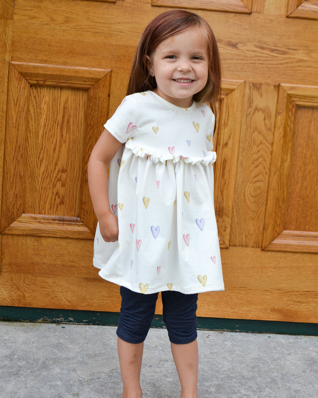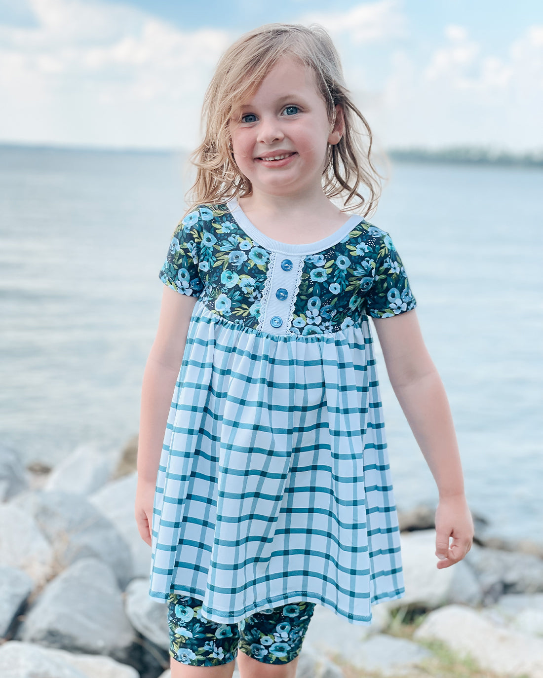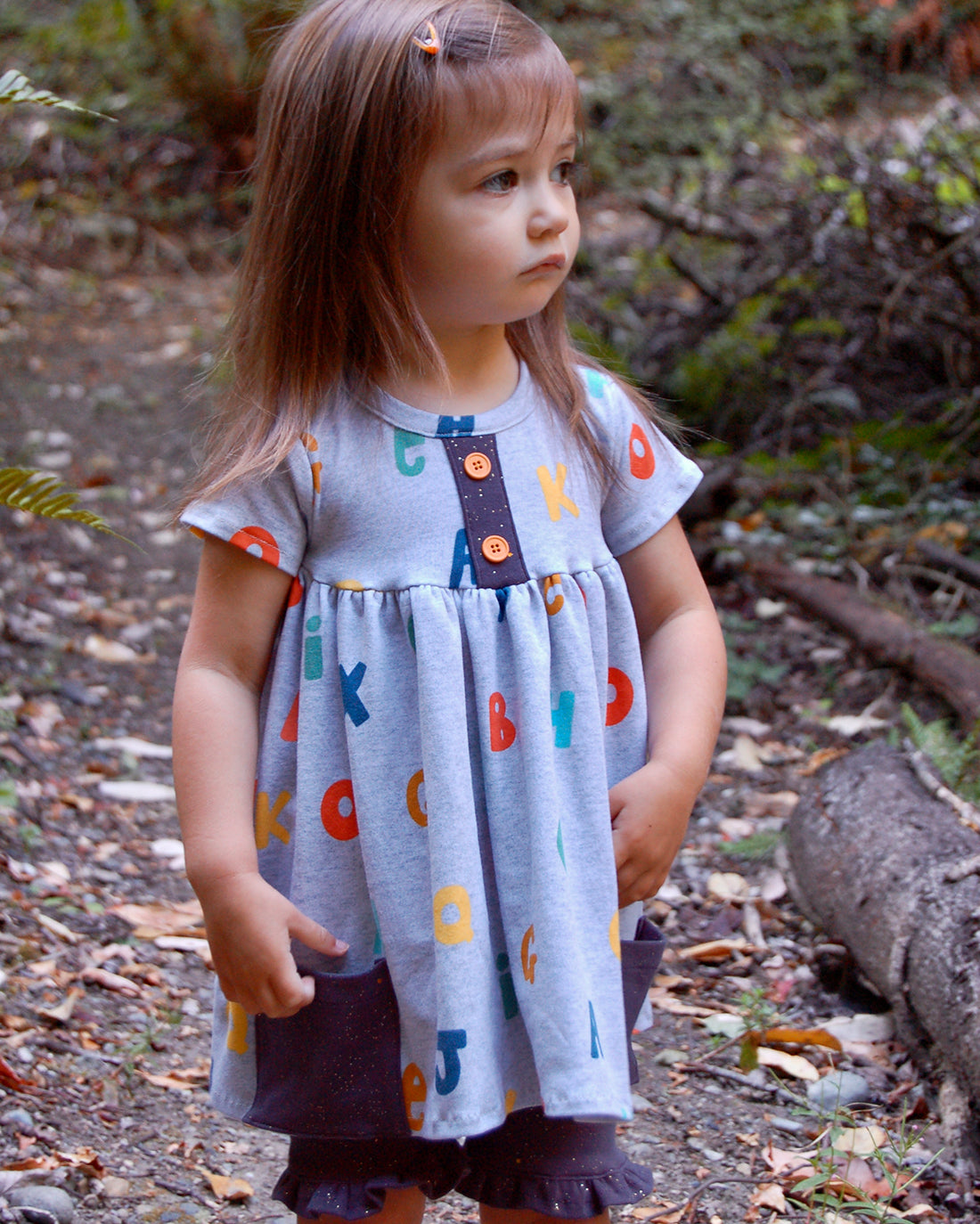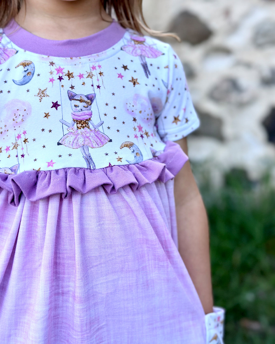 Crafted specifically for the soft embrace of knit fabrics, Lunaria guarantees a playground-ready look that combines comfort with playful elegance. Watch your child run, jump, and play without restraint, all while exuding effortless charm. With a plethora of options at your fingertips, this pattern is your ticket to a dynamic back-to-school wardrobe that captures every mood and occasion. Transition seamlessly between seasons by choosing short or long sleeves, ensuring year-round wear that adapts to the weather and your child's whims. Lunaria delights in the details. Experiment with hem finishes, from the simple classic hem to the delightful flair of a ruffle or double ruffle. Elevate the look even further with a half or full faux placket, adding a touch of sophistication to your creation. For those who appreciate an extra touch of whimsy, embrace the bodice ruffle option for an effortlessly charming vibe.