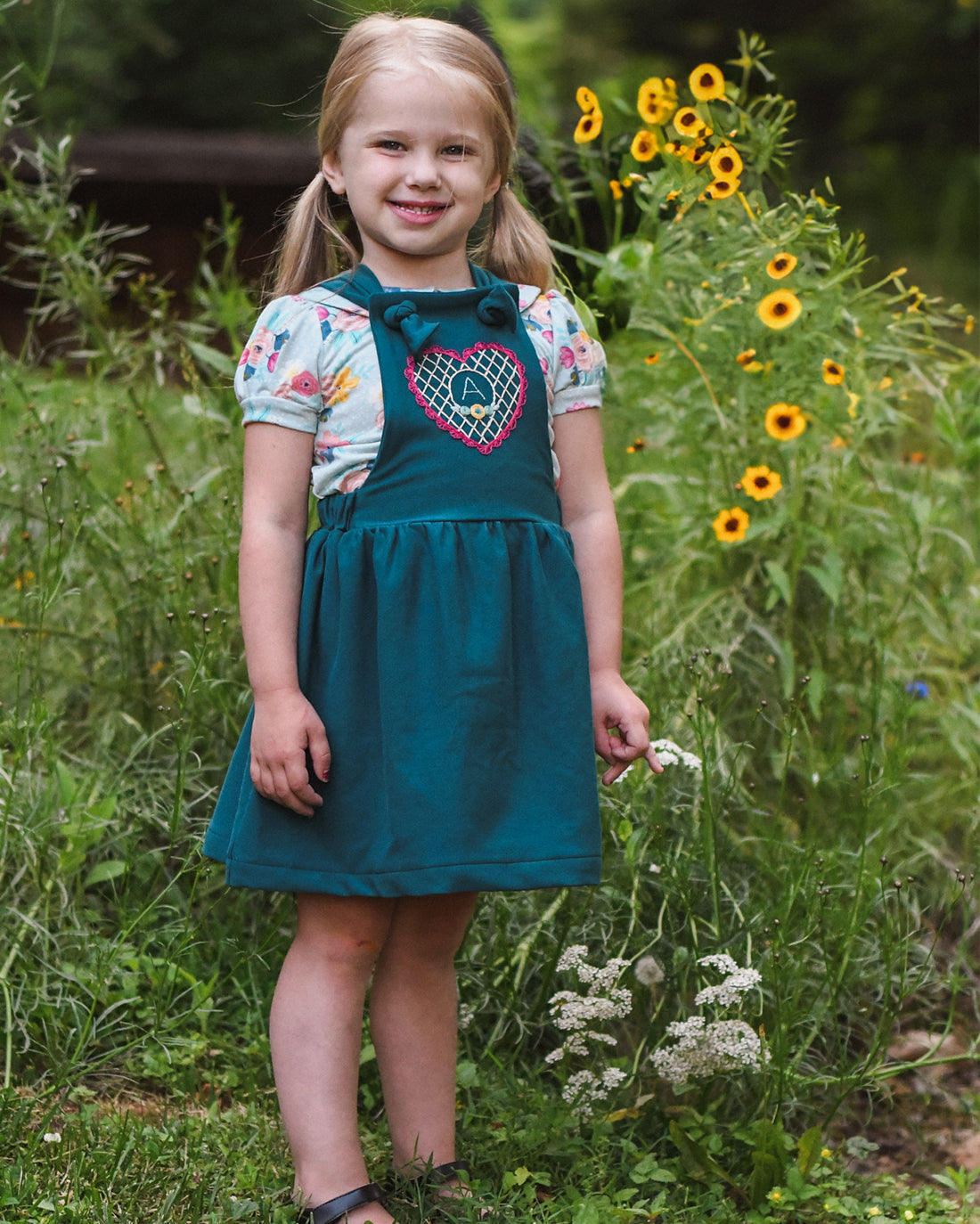 Silene is a knit Pinafore featuring a bibbed front bodice and crisscross back straps that are knot tied in the front. Silene has a gathered rectangle skirt. You can choose between a deep regular hem or fancy it up with a ruffle hem. Layer this pinafore with a short or long sleeve top, tights, or even under a cardigan for seasonal wear!