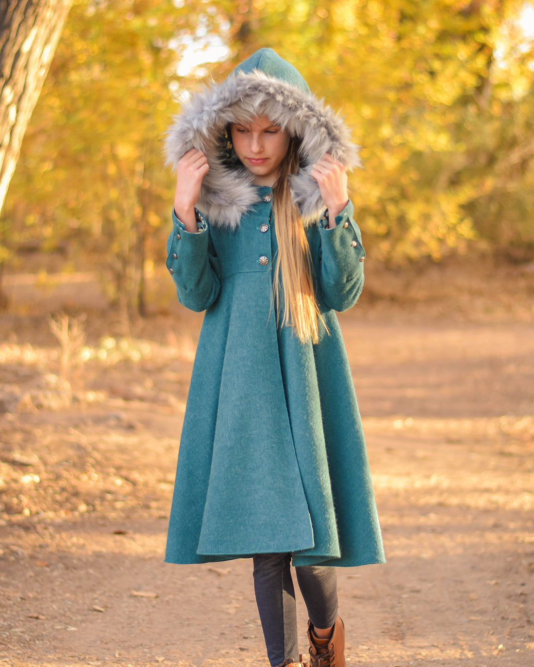 Spruce is a fully lined dress coat designed for children, with a half circle skirt, and button front closure. Spruce offers many options to make this the perfect coat for your special occasions including bell or simple cuffed sleeve options, and a voluminous hood to make that perfect statement.