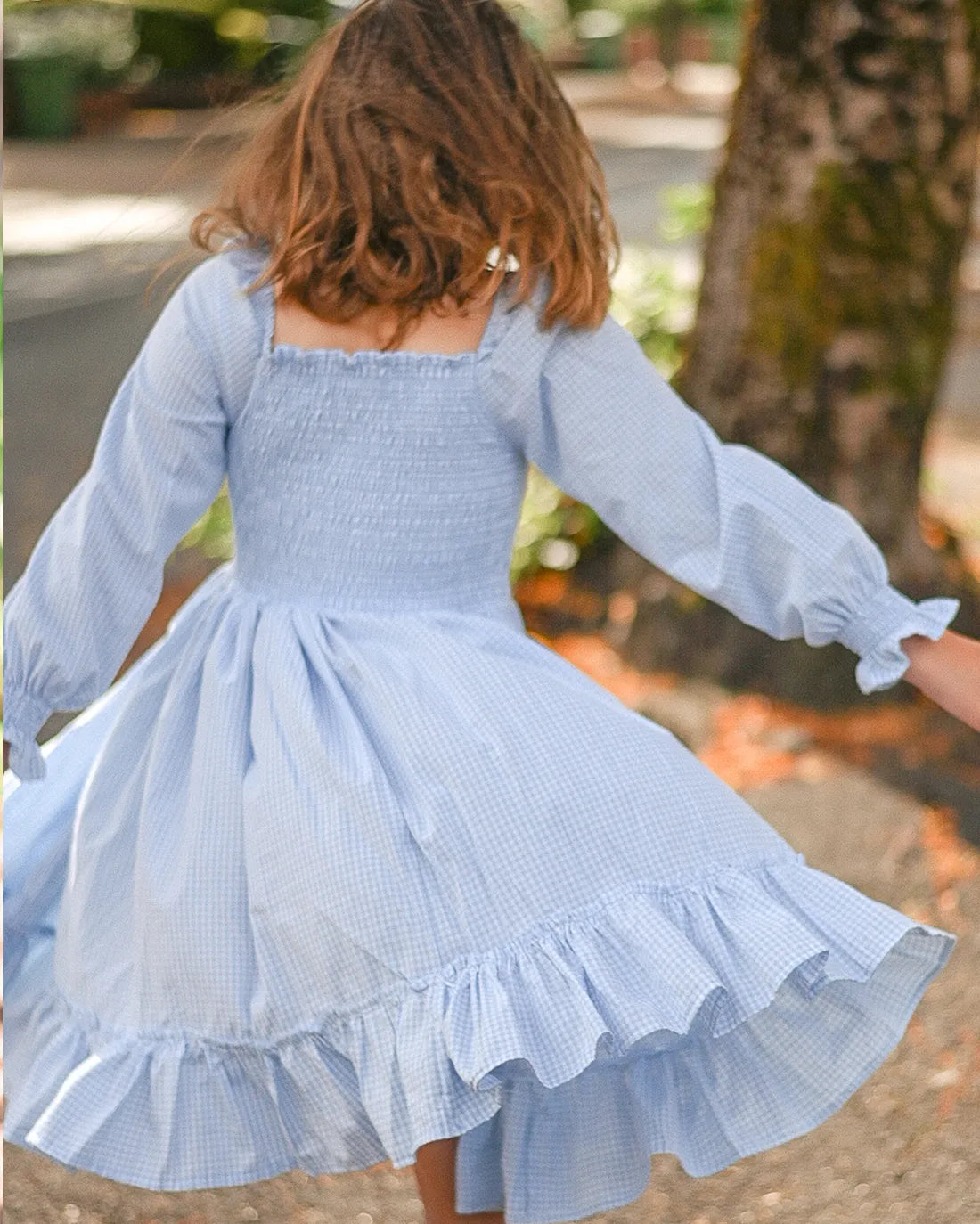 Zinnia is a stunning dress or romper for all seasons.  The shirred bodice is completely on trend and super comfy. The bodice also has a square neckline and optional ties in the back. Zinnia offers a beautiful puff sleeve with shirring just above the hemline in three lengths: short, elbow and long.   The romper is drafted up to size 4 and offers a snap crotch placket for easy changes. The dress includes several skirt options: a simple skirt, exposed ruffle skirt or tiered skirt.